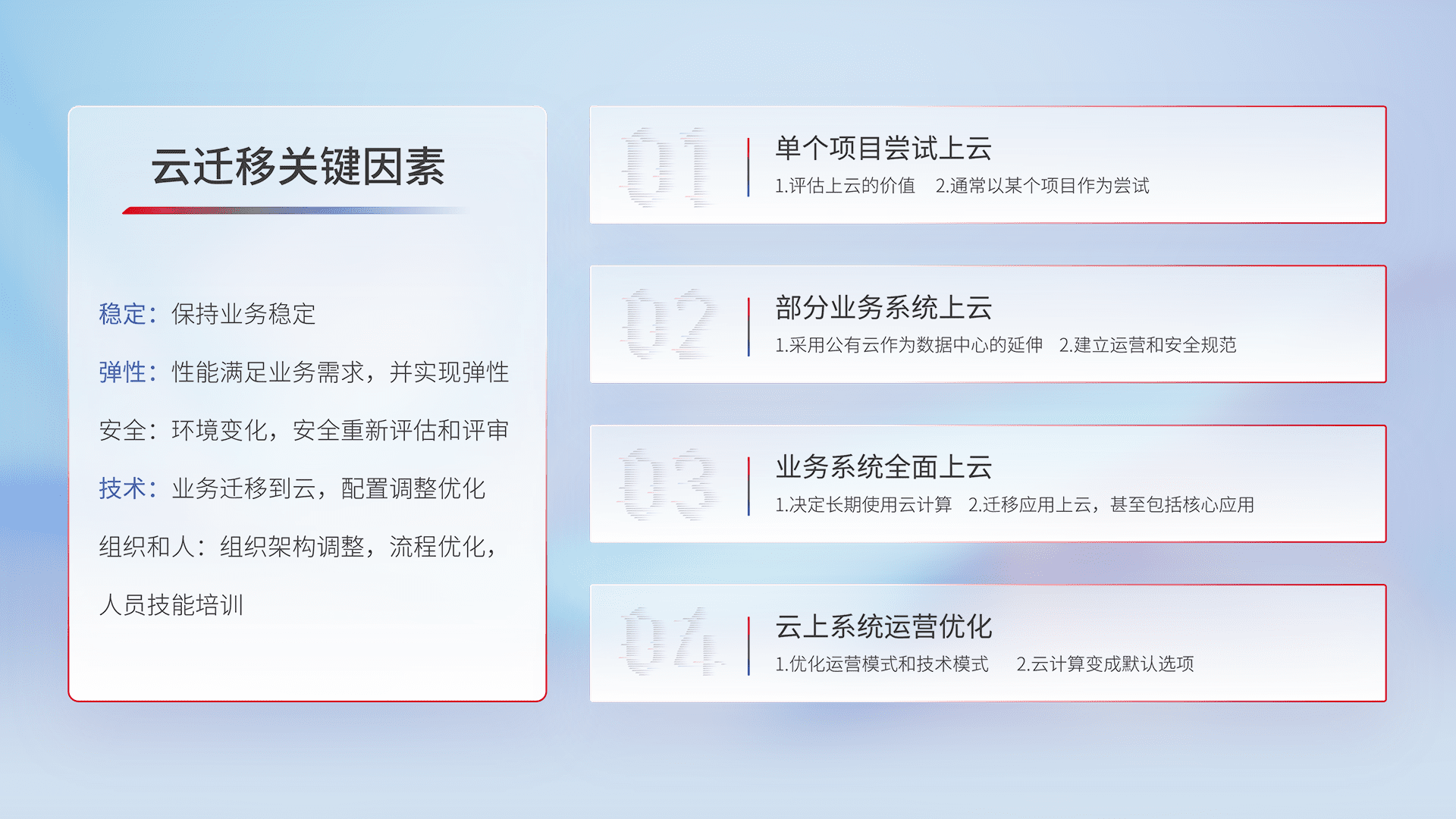 结合实际业务,,,,从规划设计、、云平台选型、、、云原生改造、、、、数据迁移、、集成交付,,,,迁移全过程为客户识别最佳上云路径,,,,做好风险识别管理,,,,设计网络架构、、、、身份权限、、、、安全审计合规、、、、操作审计、、、、日志审计、、监控告警策略、、多站点容灾设计等,,对云上基础设施进行整体规划,,,提升IT治理水平,,以满足弹性、、、高可用、、高性能的需求。。